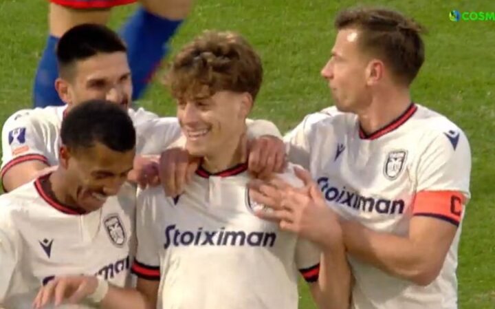 Ο Δικέφαλος άνοιξε το σκορ με τον Γιάννη Κωνσταντέλια να κάνει μια φανταστική ενέργεια παίρνοντας την μπάλα πίσω από το κέντρο και να φτάνει έξω από την περιοχή για να πλασάρει ιδανικά για το 0-1.