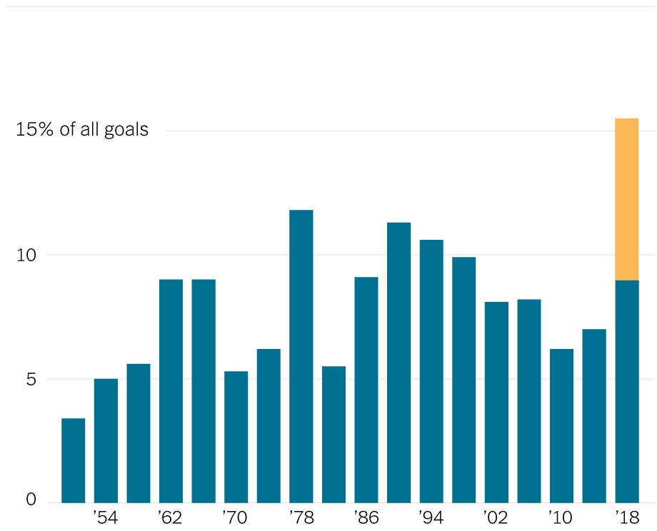 Έτσι, μέχρι στιγμής στο Παγκόσμιο Κύπελλο του 2018, το 15,5% των γκολ έρχεται από πέναλτι, ποσοστό μεγαλύτερο από όλες τις προηγούμενες διοργανώσεις. Χωρίς τα γκολ από πέναλτι που υποδείχθηκαν μέσω VAR, το ποσοστό θα ήταν στο 9%.