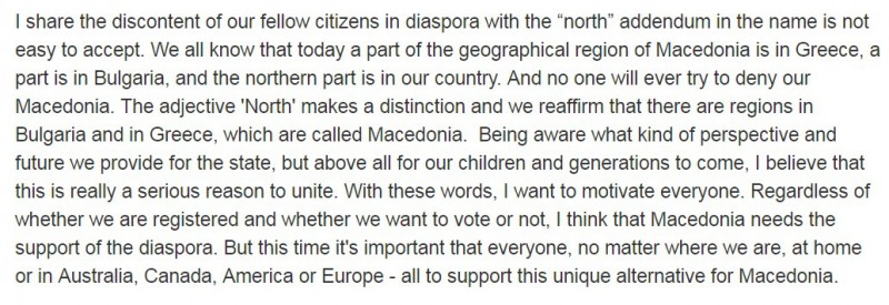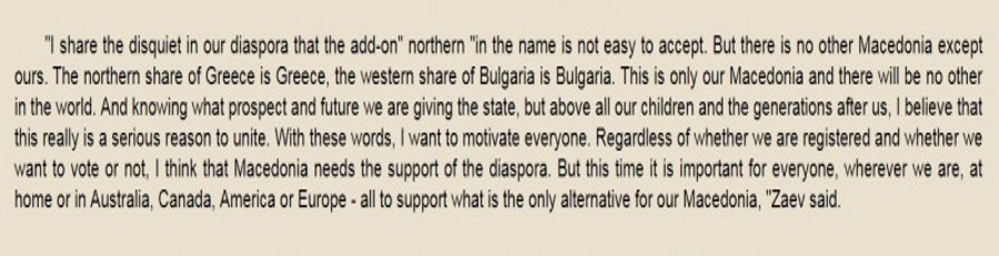 Σε συνέντευξή του, ο Ζόραν Ζάεφ μίλησε για ακόμη μία φορά για την συμφωνία των Πρεσπών τονίζοντας ότι  «η βόρεια Ελλάδα είναι Ελλάδα, η δυτική Βουλγαρία είναι Βουλγαρία. Δεν υπάρχει άλλη Μακεδονία πέρα από τη δική μας. Αυτή είναι η μόνη Μακεδονία και δεν υπάρχει άλλη στον κόσμο. Και γνωρίζοντας την προοπτική και το μέλλον αυτό πρέπει να το κάνουμε για τις επόμενες γενιές, για τα παιδιά μας. Και για αυτό πιστεύω ότι ένας σοβαρός λόγος για να ενωθούμε.