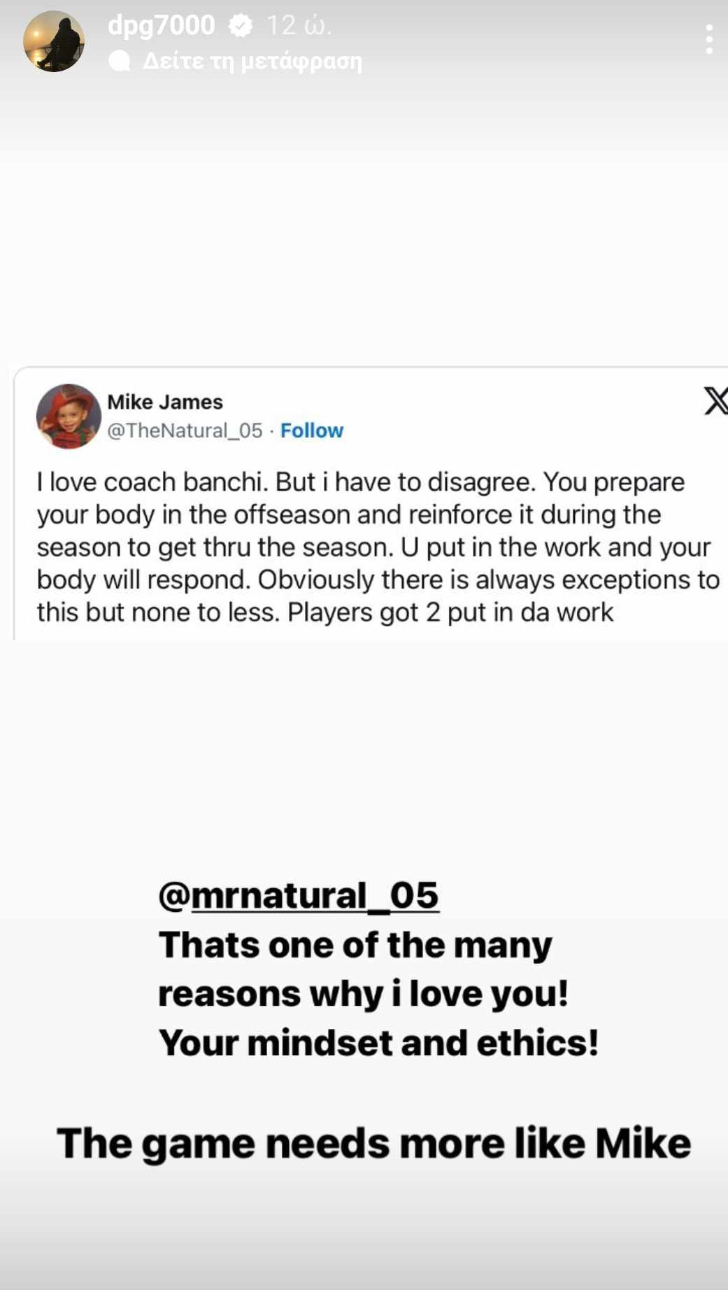 «Αυτός είναι ένας από τους πολλούς λόγους που σε αγαπώ! Για την νοοτροπία και την ηθική σου. Το παιχνίδι χρειάζεται περισσότερους σαν τον Μάικ», ανέφερε σε story ο Δημήτρης Γιαννακόπουλος.