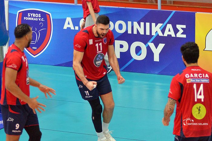 ΦΟΙΝΙΚΑΣ ΣΥΡΟΥ (Τσέντομιρ Ίλιτς): Τσέιβερς 5 (5/10 επ., 27% υπ. – 18% άριστες), Μπράιαν 17 (10/16 επ., 2 άσοι, 5 μπλοκ), Ασπιώτης 21 (17/39 επ., 1 άσος, 3 μπλοκ), Γκαρσία 3 (2/3 επ., 1 μπλοκ), Μπαρμπούνης 13 (11/21 επ., 2 άσοι, 53% υπ. – 44% άριστες), Μανωλάκης 10 (7/13 επ., 2 άσοι, 1 μπλοκ) / Σωνάκης (λ,. 60% υπ. – 30% άριστες), Γκόμεζ 7 (3/14 επ., 4 μπλοκ, 85% υπ. – 54% άριστες).