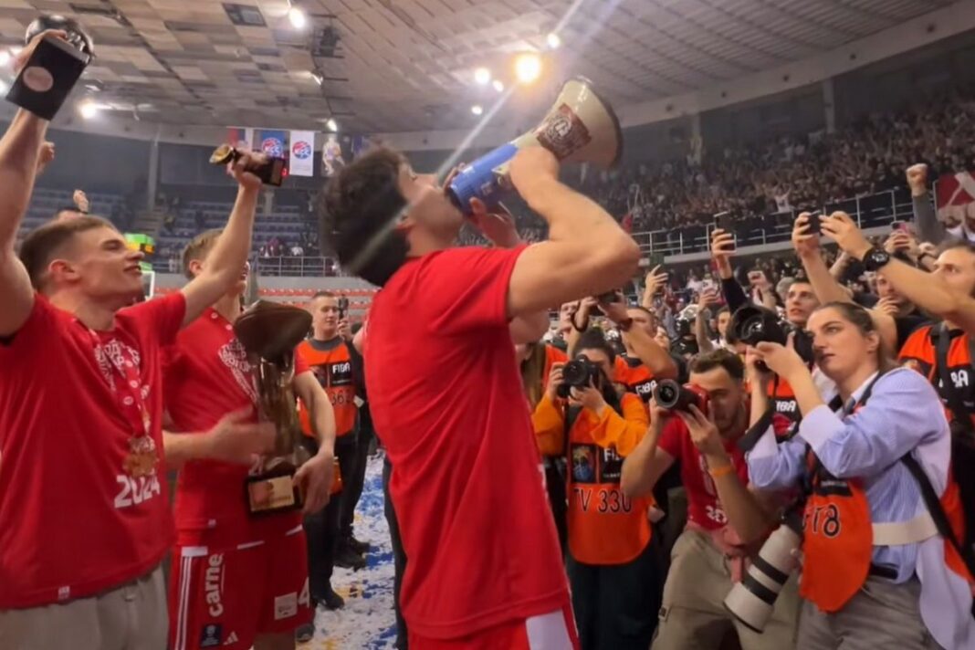 Φανερά χαρούμενος από το πρώτο τρόπαιο που σηκώνει μέσα στο 2024 ο αρχηγός του Ερυθρού Αστέρα πήρε την ντουντούκα μετά τη λήξη και έγινε οργανωτής στην κερκίδα του Ερυθρού Αστέρα με χιλιάδες οπαδούς της ομάδας αλλά και τους συμπαίκτες του να τον αποθεώνουν.