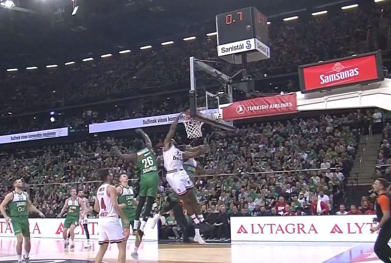 Ο Αμερικανός εκρηκτικός γκαρντ του Ολυμπιακού έτρεξε όλο το γήπεδο και κάρφωσε σε νεκρό χρόνο στη ρακέτα της Ζαλγκίρις για το 39-41 σε μια ασύλληπτη φάση (υπάρχει και φάουλ του Σάμνερ που δεν δόθηκε).
