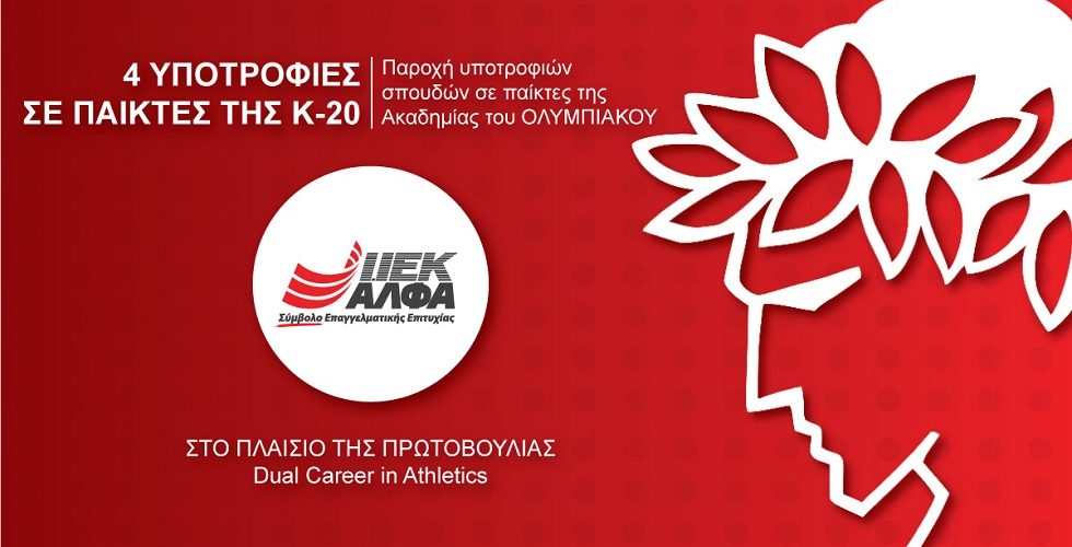 Δίπλα στον Ολυμπιακό και στους αθλητές της ερυθρόλευκης Ακαδημίας στέκεται έμπρακτα για μία ακόμα χρονιά το ΙΕΚ ΑΛΦΑ, το οποίο στο πλαίσιο του προγράμματος «Dual Career In Athletics» ανακοίνωσε τη χορήγηση 4 υποτροφιών σε αθλητές της Κ20 των Πειραιωτών.