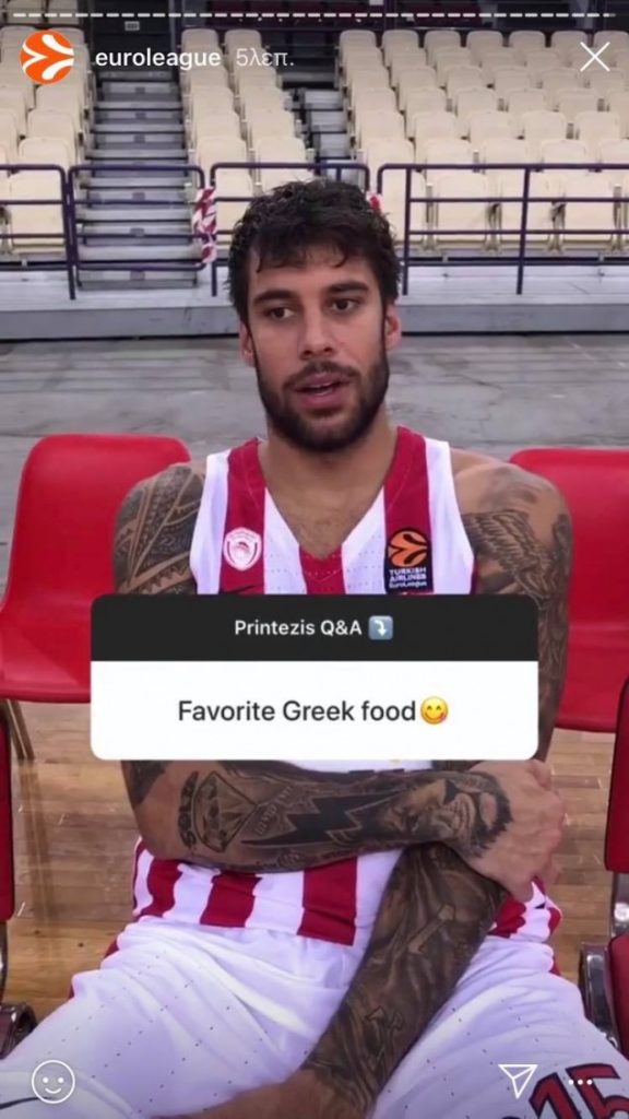 Ο υπαρχηγός του Ολυμπιακού στο «Q&A» της διοργανώτριας αρχής στο Instagram ρωτήθηκε ποιο είναι το αγαπημένο του φαγητό. Αφού το σκέφτηκε για λίγο, απάντησε χαμογελαστός με μία λέξη: «Σουβλάκι».