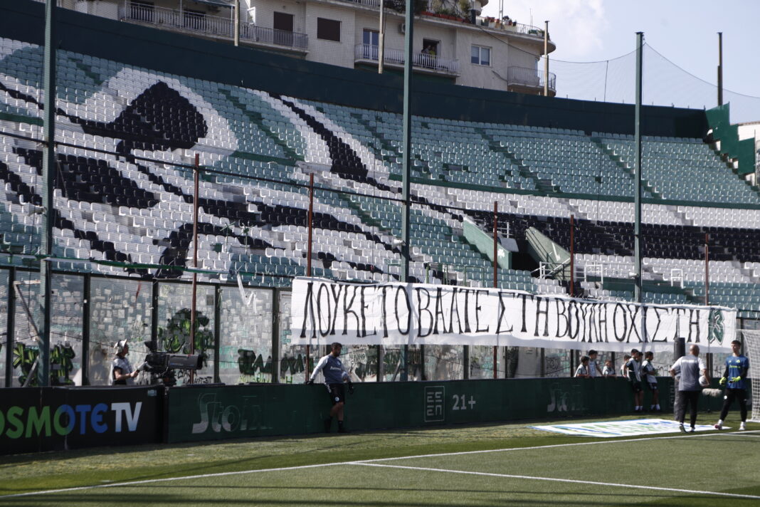 Με διοικητικό πρόστιμο ύψους 20.000 ευρώ τιμωρήθηκε ο Παναθηναϊκός για πανό με πολιτικό περιεχόμενο «Λουκέτο βάλτε στη Βουλή, όχι στη Θύρα 13» στο ματς των πλέι οφ με τη Λαμία, κι ενώ η θύρα των οργανωμένων των Πρασίνων ήταν κλειστή λόγω προηγούμενης τιμωρίας από το κορεό με τον… φλεγόμενο Λευκό Πύργο στο ντέρμπι με τον ΠΑΟΚ.