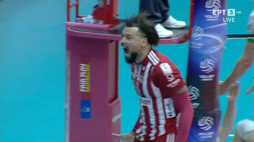 Ο Γερμανοκουβανός άσος των Ερυθρολεύκων με τρομερό τρόπο έσωσε την άμυνα για την ομάδα του και στη συνέχεια της εντυπωσιακής φάσης ανέλαβε δράση το «ερυθρόλευκο» μπλοκ για έναν τρομερό πόντο κατά τη διάρκεια του τέταρτου σετ.