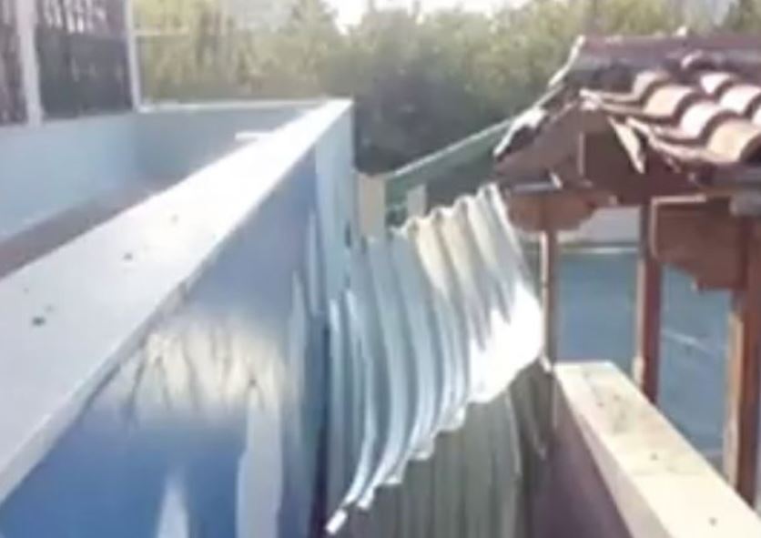 Στην εικόνα που προέβαλε ο ΣΚΑΪ φαίνονται τμήματα από τη σκεπή να έχουν αποκολληθεί και να έχουν πέσει στο πλάι του σχολείου.