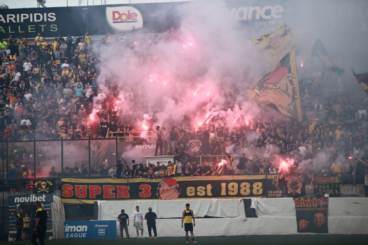 Οι φίλοι των Θεσσαλονικέων άναψαν πυρσούς κατά την αναχώρηση της ομάδας και ζήτησαν ξανά το Κύπελλο από τους ποδοσφαιριστές του Άκη Μάντζιου.
