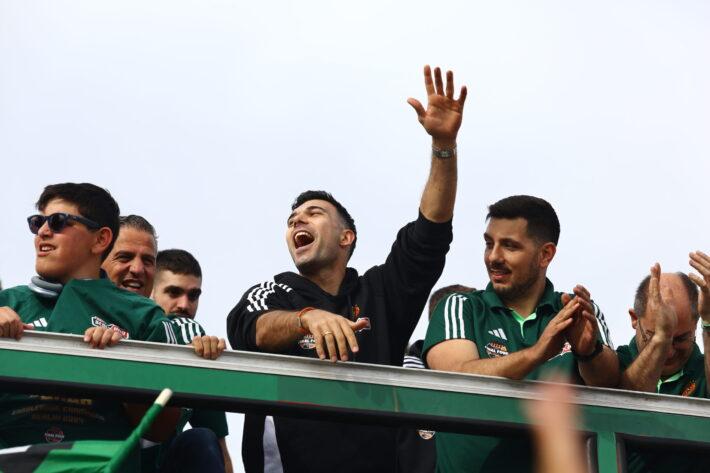 Στο επίκεντρο των πανηγυρισμών βρέθηκε ο αρχηγός του «τριφυλλιού», Κώστας Σλούκας, ο οποίος πήρε το μικρόφωνο μέσα από το ανοιχτό πούλμαν και μίλησε στο «πράσινο» κοινό ευχαριστώντας τους για τη στήριξή τους και τονίζοντας πως παρά την κατάκτηση ευρωπαϊκού τροπαίου μετά από 13 χρόνια βασικός στόχος της σεζόν είναι το πρωτάθλημα στις μάχες που αναμένεται να δοθούν ανάμεσα σε Παναθηναϊκό και Ολυμπιακό μέσα στον Ιούνιο.