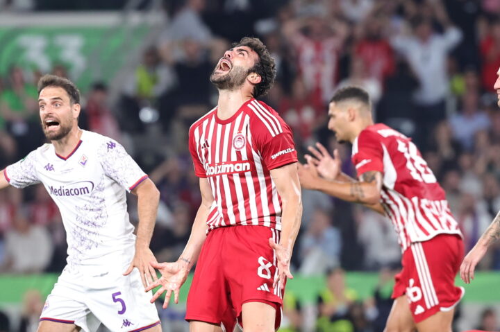 Ολυμπιακός και Φιορεντίνα μονομαχούν στην OPAP Arena με φόντο το τρόπαιο του Conference League σε ένα παιχνίδι με αρκετή ένταση, καλό ρυθμό και φάσεις εκατέρωθεν.