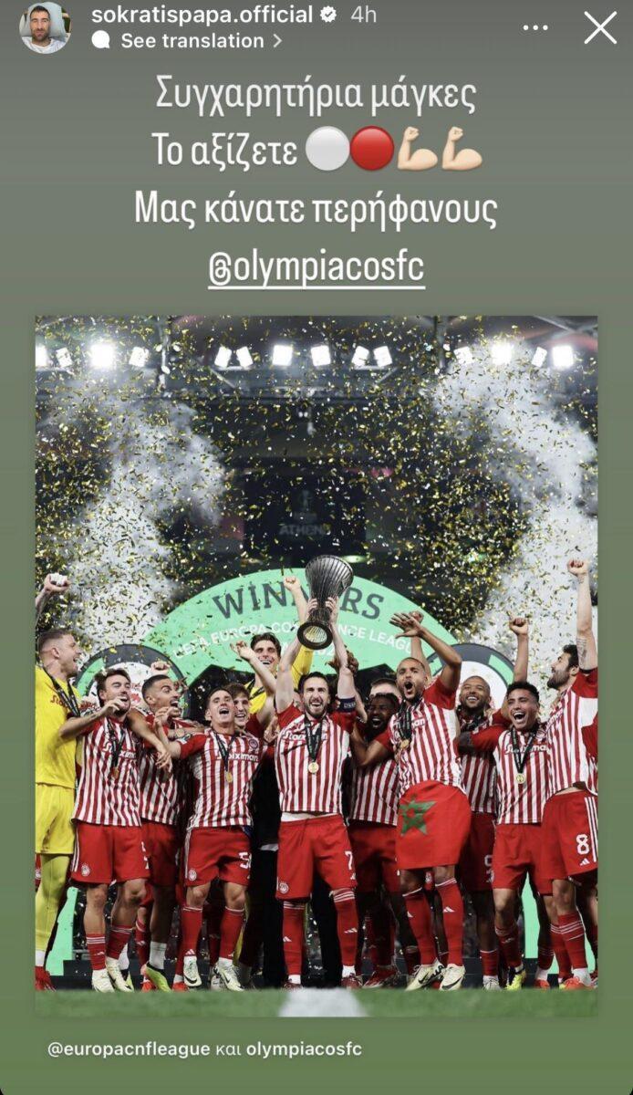 Ο Σωκράτης Παπασταθόπουλος συνεχάρη με την ψυχή του τον Ολυμπιακό και τους ποδοσφαιριστές για την κατάκτηση του Conference. Ο πολύπειρος ποδοσφαιριστής δήλωσε υπερήφανος για το μοναδικό ερυθρόλευκο επίτευγμα του συλλόγου και τόνισε πως το αξίζουν άπαντες.