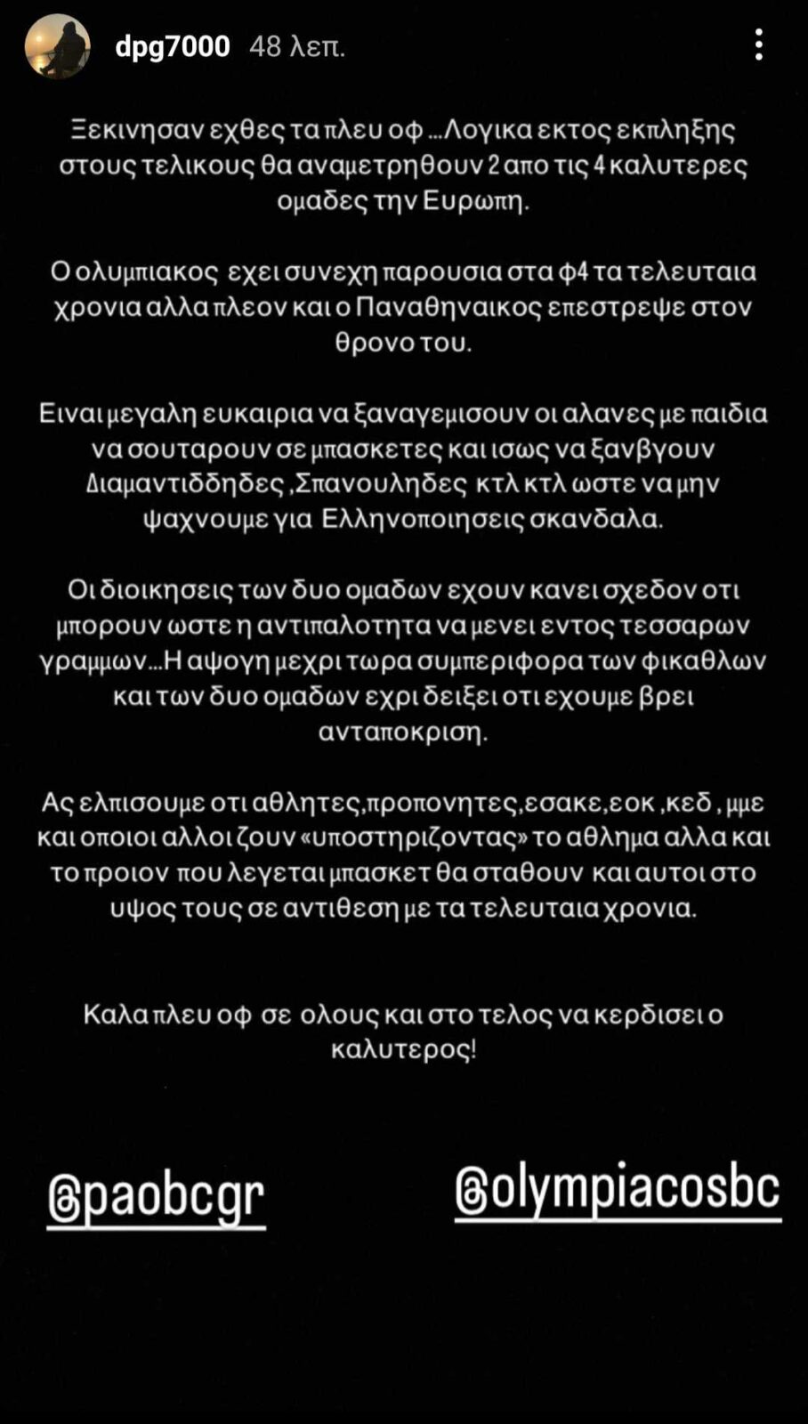 Καλά playoffs σε όλους και στο τέλος να κερδίσει ο καλύτερος».