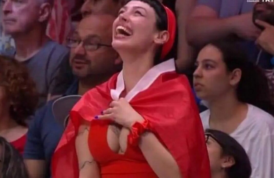Στα πλάνα φαίνεται η νεαρή Τουρκάλα να πανηγυρίζει για τη νίκη με 3-2 της Τουρκίας επί των ΗΠΑ με το βαθύ ντεκολτέ της, μάλιστα, κάποια στιγμή να την προδίδει.