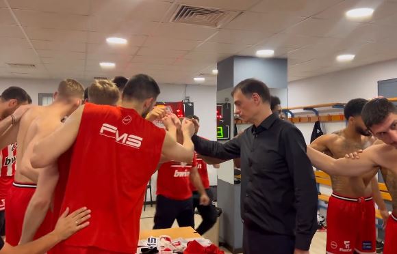 «Θέλω να σας συγχαρώ για το ομαδικό πνεύμα που επιδείξατε. Παίξαμε ως ομάδα και ελέγξαμε τον ρυθμό του παιχνιδιού για σαράντα λεπτά. Ήταν πολύ σημαντική νίκη. Πάντα το να κερδίζεις το πρώτο εκτός έδρας παιχνίδι είναι σημαντικό. Όμως, ακούστε… Ήταν απλά ένα παιχνίδι. Η σειρά είναι best of five. Οπότε βάλτε τα κεφάλια κάτω και ελάτε να αντιμετωπίσουμε το επόμενο ματς με την ίδια νοοτροπία. Ελάτε να προετοιμαστούμε και να δούμε τι μπορούμε να κάνουμε καλύτερα ή τι πρέπει να αποφύγουμε, για να παίξουμε ακόμα καλύτερα την Παρασκευή», είπε στους παίκτες του με το στιγμιότυπο να απαθανατίζεται από την κάμερα της ερυθρόλευκης ΚΑΕ στα αποδυτήρια και να δημοσιεύεται την επομένη της σπουδαίας νίκης.