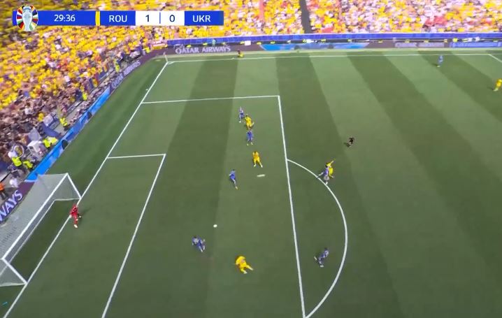 Οι Ρουμάνοι πίεσαν ψηλά, ο Λούνιν έκανε λάθος απομάκρυνση με την μπάλα να φτάνει στον Μαν και αυτός πάσαρε στον Στάντσιου, ο οποίος σούταρε με τη μία χωρίς να το σκεφτεί και πέτυχε ένα πανέμορφο γκολ με σουτ έξω από την περιοχή.