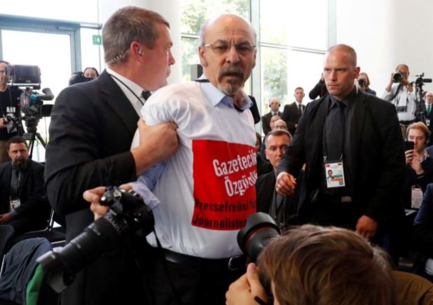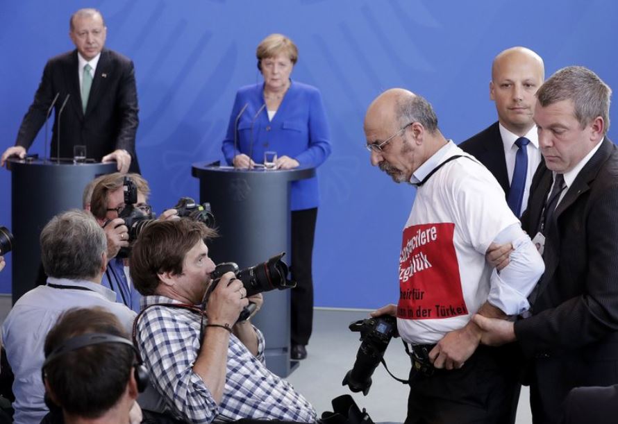 Επεισοδιακή ήταν η συνέντευξη Τύπου της Ανγκελα Μέρκελ και του Ταγίπ Ερντογάν στο Βερολίνο, καθώς ένας Τούρκος δημοσιογράφος εμφανίστηκε μ’ ένα μπλουζάκι που έγραφε στα γερμανικά και τα τουρκικά: «Ελευθερία Τύπου για τους δημοσιογράφους στην Τουρκία».