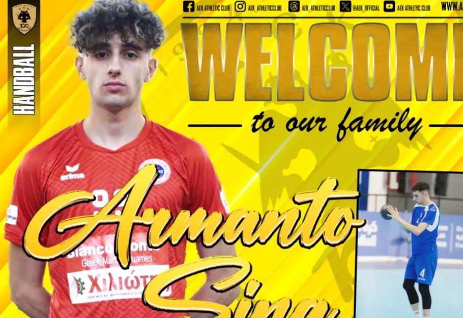 «Η ΑΕΚ βρίσκεται στην πολύ ευχάριστη θέση να ανακοινώσει την έναρξη της συνεργασίας της με τον Αρμάντο Σίνα. Ο 22χρονος αριστερός εξτρέμ (13/02/2002) θα ενισχύσει τη νέα σεζόν το τμήμα του Χάντμπολ Ανδρών.