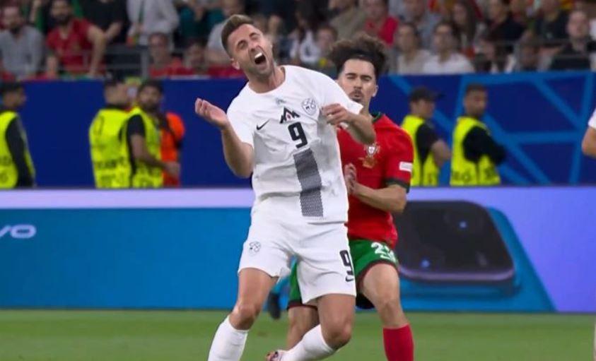 Ο Σλοβένος επιθετικός προσπάθησε να εκμαιεύσει φάουλ σε μια φάση που δεν υπάρχει καν φάουλ από τον Βιτίνια, με τον πολύπειρο διαιτητή Ντανιέλ Ορσάτο να μην ξεγελιέται από το θεατρικό πέσιμο και να δίνει συνέχεια στο παιχνίδι.