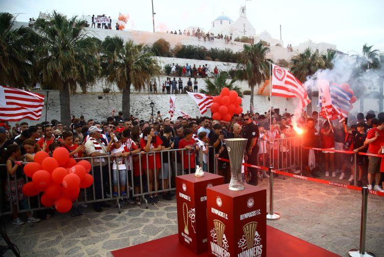 Πλήθος κόσμου στην Πάρο υποδέχθηκε τα ευρωπαϊκά τρόπαια του Ολυμπιακού στο πλαίσιο της θρυλικής περιοδείας.