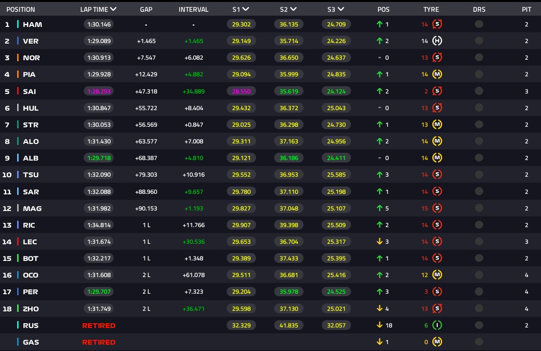 Σε έναν αγώνα με τρομερές διακυμάνσεις και αρκετή βροχή στη Μ. Βρετανία ο Ράσελ τα έκανε θάλασσα από ένα σημείο και μετά κυρίως λόγω των προβλημάτων που εμφάνισε το μονοθέσιό του, με τον Νόρις να το εκμεταλλεύεται και να παίρνει σημαντικό προβάδισμα, το οποίο ωστόσο έχασε στη συνέχεια λόγω της κακής του στρατηγικής, με τον πολύπειρο Χάμιλτον να βγαίνει μπροστά και να κρατάει την πρωτιά μέχρι το τέλος.