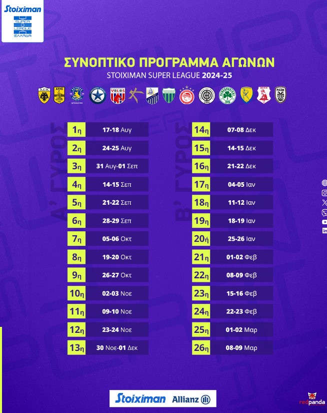 «Δείτε το ετήσιο συνοπτικό πρόγραμμα αγώνων της κανονικής περιόδου του Πρωταθλήματος Stoiximan Super League 2024-25, το οποίο εγκρίθηκε ομόφωνα στη συνεδρίαση του Διοικητικού Συμβουλίου της Super League της 10ης Ιουλίου 2024.