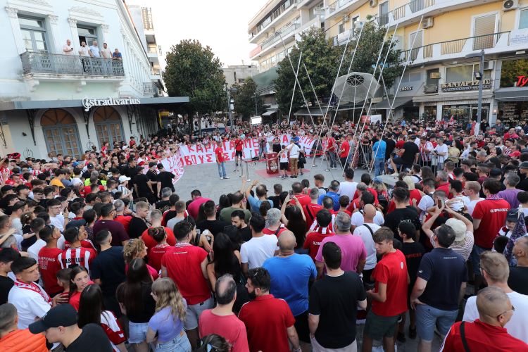 Ο κόσμος του Ολυμπιακού συγκεντρώθηκε στην αρχή του Πεζοδρόμου Ασκληπιού και περίμενε υπομονετικά παρά τον καύσωνα για να θαυμάσει από κοντά και να φωτογραφηθεί με τις δύο κούπες.