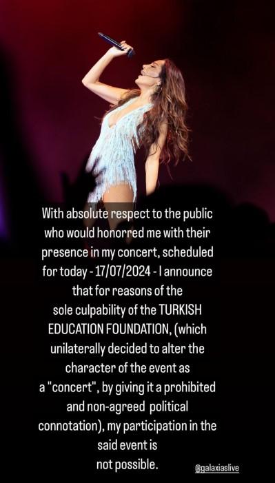 «Ως εκ τούτου η συμμετοχή μου στη συναυλία δεν ήταν δυνατή» πρόσθεσε η Δέσποινα Βανδή.