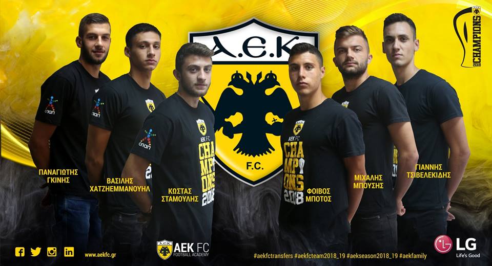 «Επαγγελματικά συμβόλαια υπέγραψαν σήμερα έξι ποδοσφαιριστές της ομάδας Κ20 της ΑΕΚ, οι Γιάννης Τσιβελεκίδης, Παναγιώτης Γκίνης, Βασίλης Χατζηεμμανουήλ, Μιχάλης Μπούσης, Φοίβος Μπότος και Κώστας Σταμούλης.