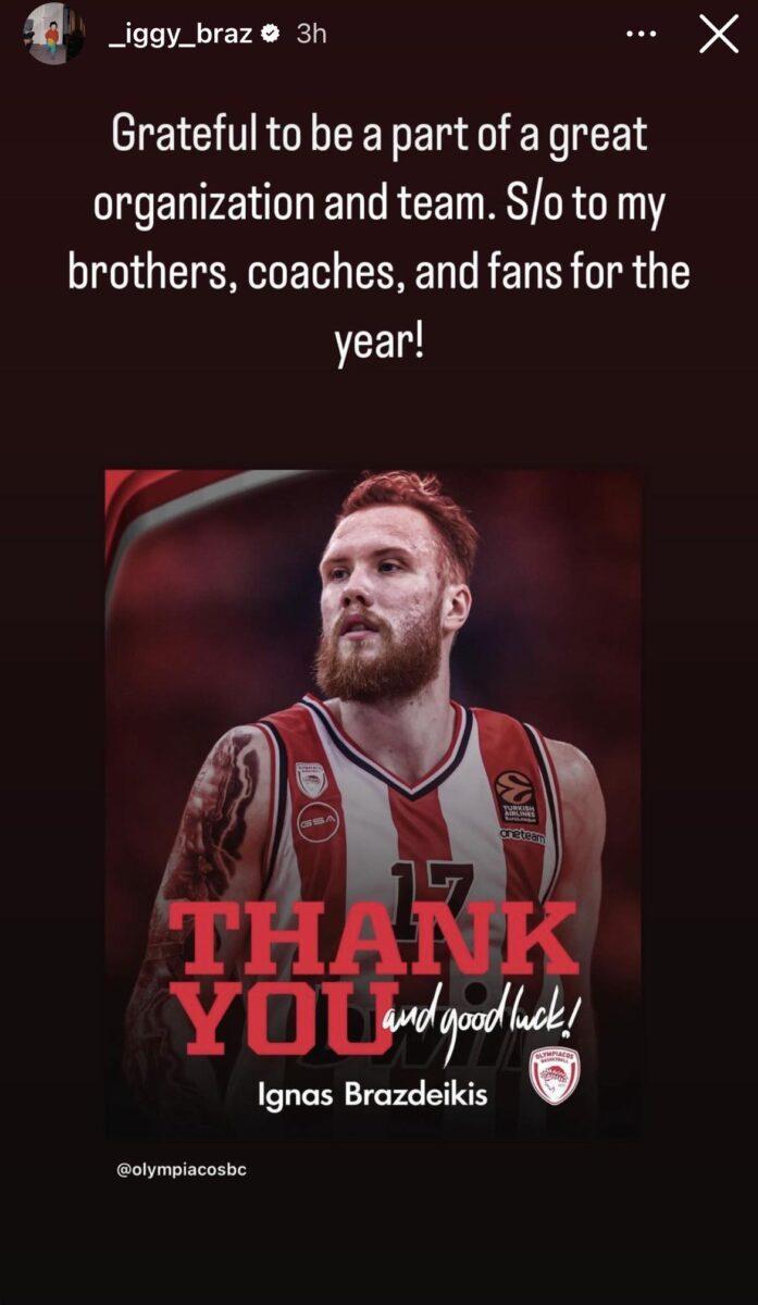 «Ευγνώμων που ήμουν μέλος ενός σπουδαίου οργανισμού και ομάδας. Μπράβο στα αδέλφια μου, τους προπονητές και τους οπαδούς για τη χρονιά», έγραψε ο Λιθουανός.