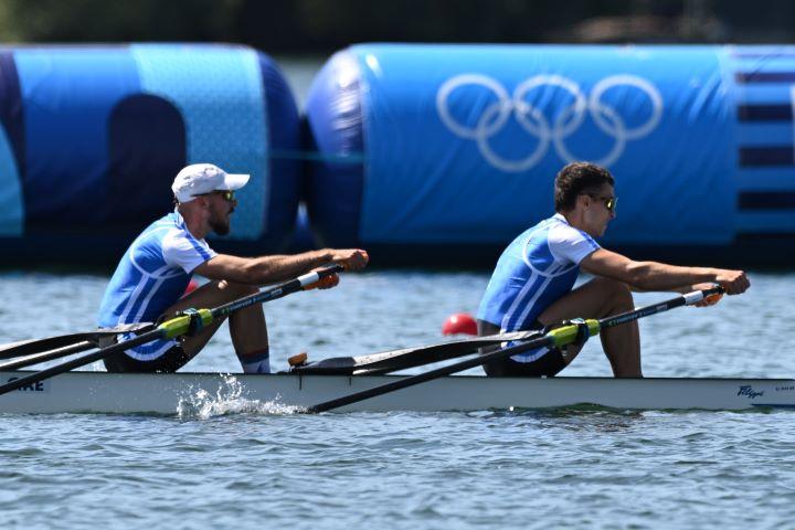 Συγκεκριμένα, οι Αντώνης Παπακωνσταντίνου και Πέτρος Γκαϊδατζής τερμάτισαν σε 6:46.90, πίσω από τους δεύτερους Νορβηγούς Λαρς Μάρτιν Μπένσκε και Ασκ Γιαρλ Τζόεμ (6:41.77) και τους πρώτους Ιρλανδούς (6:34.12) Φίνταν ΜακΚάρθι και Πολ Ο’Ντόνοβαν. Οι Ιρλανδοί και οι Νορβηγοί σκιφίστες εξασφάλισαν την απευθείας πρόκριση στα ημιτελικά, τα οποία είναι προγραμματισμένα για την Τετάρτη (31/7) και ώρα 12:14.