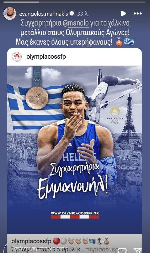 Όλη η Ελλάδα πανηγυρίζει για την επιτυχία αυτή του αθλητή του Ολυμπιακού, με τον Βαγγέλη Μαρινάκη να τον συγχαίρει μέσω του προσωπικού του λογαριασμού στο Instagram.