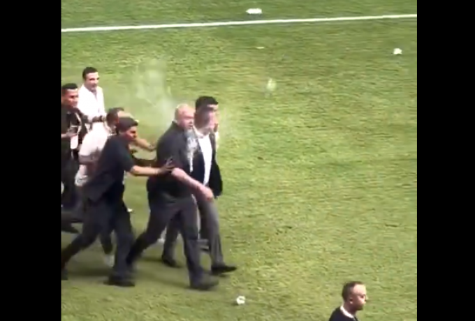 Ο πρόεδρος της Φενέρμπαχτσε, Αλί Κοτς, δέχθηκε επίθεση με βροχή αντικειμένων (μάλιστα ένα μισογεμάτο μπουκάλι τον βρήκε στο πρόσωπο) ενώ την ίδια στιγμή τον έσμπρωχνε ένας διαπιστευμένος της Γκεζτέπε, με τις εικόνες να κάνουν ήδη τον γύρο του διαδικτύου και να είναι σοκαριστικές.