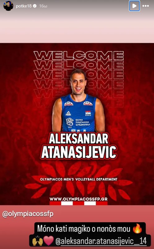 Ο Αλεξάνταρ Ατανασίεβιτς είναι και επίσημα παίκτης του Ολυμπιακού. Ο άνθρωπος που χαρακτηρίζεται «θρύλος του σερβικού βόλεϊ» από τους συμπατριώτες του θα φοράει πλέον τα ερυθρόλευκα και ένας από τους πρώτους που έσπευσαν να τον αποθεώσουν ήταν ο Μάρκο Ποντρασκάνιν.