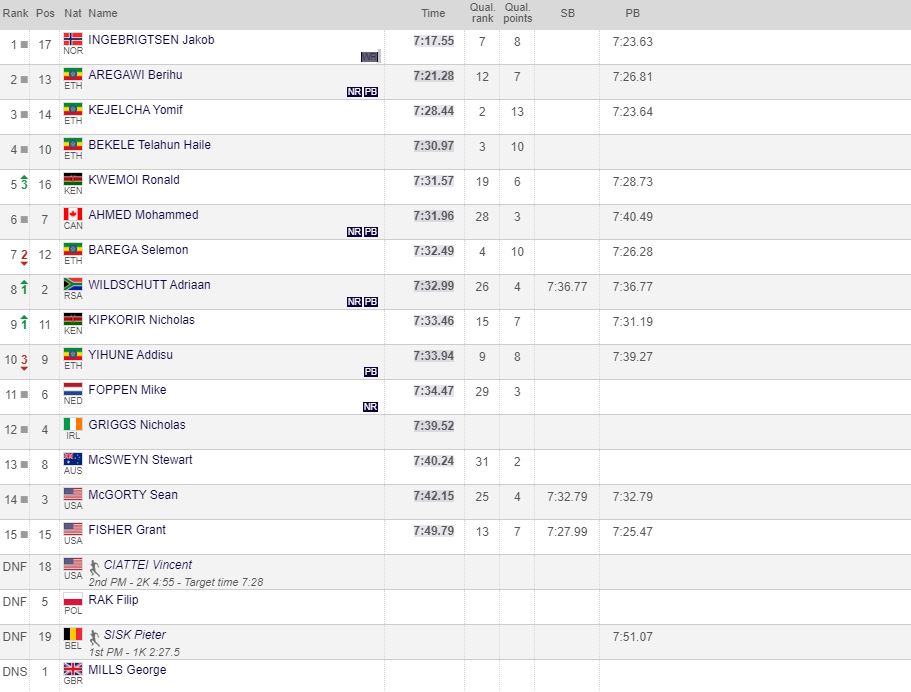 Τη δεύτερη θέση κατέλαβε ο Μπέριχου Αρεγκάβι με 7:21.28 ενώ στην 3η βρέθηκε ο επίσης Αιθίοπας Γιόμιφ Κετζέλτσα με 7:28.44.