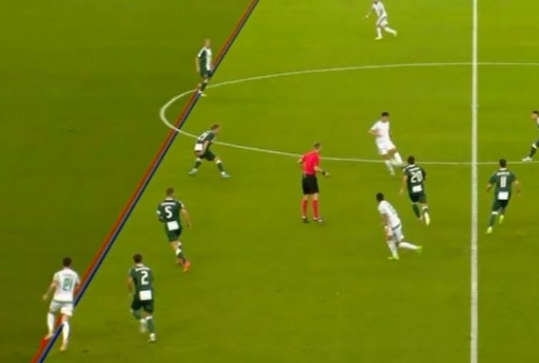 Η αλήθεια είναι πως ο Σλοβένος φεύγει από τα αριστερά οριακά και παρότι στην κανονική ροή φάνηκε να καλύπτεται από τον Μαξ, ο Τζήλος συμφώνησε με τον επόπτη που σήκωσε οφσάιντ με το που πέτυχε το γκολ ο Γιαννιώτας και τοποθέτησε τις γραμμές με τρόπο που φαίνεται εκτεθειμένος ο Όζμπολτ (η κόκκινη γραμμή μπροστά από την μπλε).