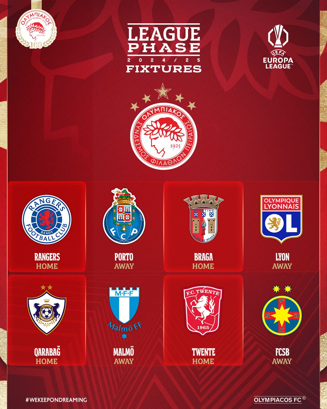 Καλή κλήρωση για Ολυμπιακό: Αυτοί είναι οι οχτώ αντίπαλοι στη League Phase του Europa