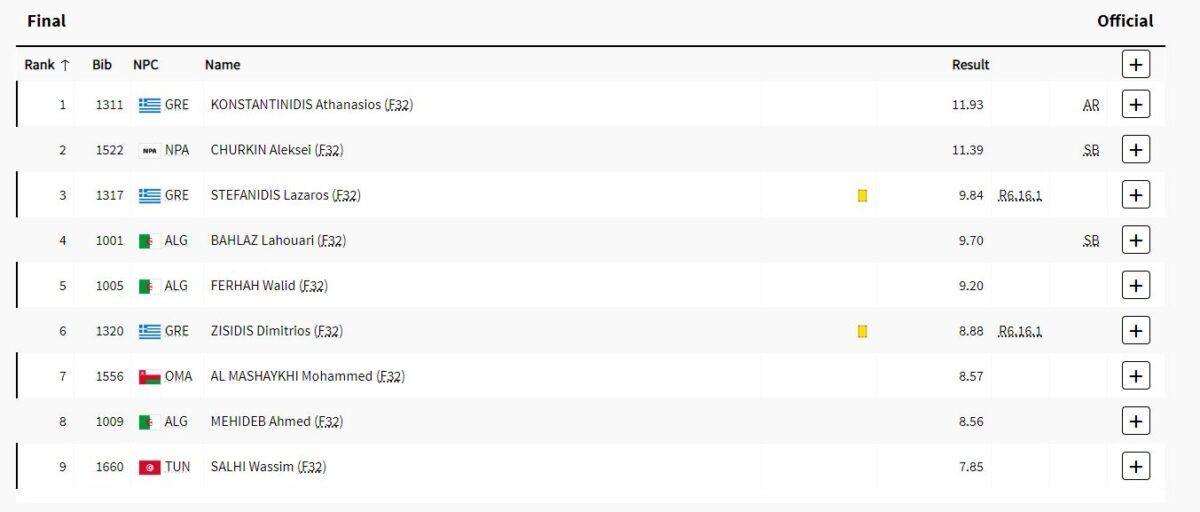 Διπλός θρίαμβος για τα ελληνικά χρώματα στον τελικό της σφαιροβολίας F32 στους Παραολυμπιακούς Αγώνες στο Παρίσι καθώς ο Θανάσης Κωνσταντινίδης κατέκτησε το χρυσό μετάλλιο με πανευρωπαϊκό ρεκόρ (11,93μ.) ενώ ο Λάζαρος Στεφανίδης απέσπασε το χάλκινο στα 9,84μ. με την Ελλάδα να φτάνει τα οχτώ μετάλλια στη διοργάνωση και τον 54χρονο χρυσό παραολυμπιονίκη να πανηγυρίζει το δεύτερο μετάλλιο στους φετινούς αγώνες και τον 67χρονο να κατακτά το χάλκινο σε μια ιστορική στιγμή.