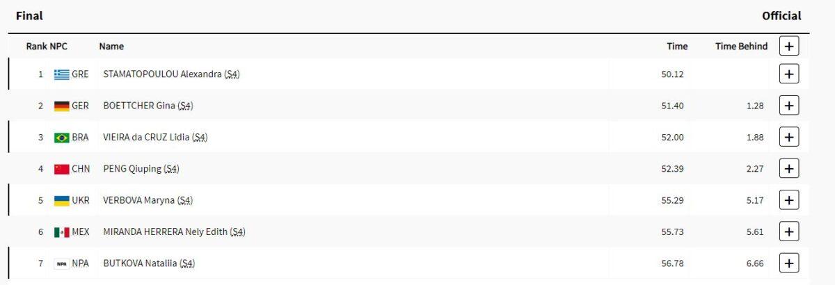 Η Γερμανίδα Τζίνα Μπότσερ απέσπασε το ασημένιο μετάλλιο με 51.40 ενώ η Βραζιλιάνα Λίντια Βιέρα Ντε Κρουζ πήρε το χάλκινο και συμπλήρωσε την τριάδα στο βάθρο.