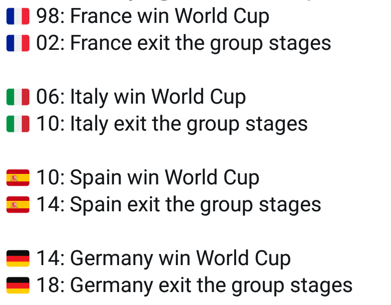 Από το Μουντιάλ του 2002, άρχισε η «κακοδαιμονία» των κατόχων του Παγκοσμίου Κυπέλλου. Η Γαλλία, κάτοχος του στέμματος το 1998, αποκλείστηκε στη φάση των ομίλων. Ακολούθησε η Ιταλία το 2010 που ήταν κάτοχος του τίτλου το 2006. Επόμενο «θύμα» η Ισπανία που πήρε το Μουντιάλ το 2010 και αποκλείστηκε στους ομίλους το 2014. Και φτάσαμε στη Γερμανία που πήρε τον τίτλο το 2014 και αποκλείστηκε στη φάση των ομίλων το 2018!