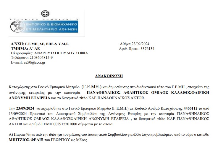 Αδιάβαστος και με βαθύ πόνο ο Ολυμπιακός, όπως ακριβώς τόνισε ο Δημήτρης Γιαννακόπουλος, δεν ήξερε ότι ο κύριος Φέλιξ Μπίτζιος είχε παραιτηθεί από τις 13/9 από το ΔΣ της ΚΑΕ Παναθηναϊκός, προλαβαίνοντας ακόμα και το υπουργείο Οικονομικών των ΗΠΑ. Αδιάβαστο ήταν επίσης και το ΓΕΜΗ, το οποίο ενημερώθηκε μόλις τη Δευτέρα 23/9 για την από 13/9 παραίτηση του κυρίου Μπίτζιου όπως φαίνεται και από το παρακάτω αποκαλυπτικό έγγραφο.