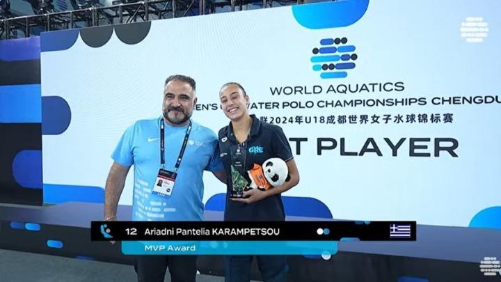 Το αστέρι της Αριάδνης Καραμπέτσου έλαμψε και στο Παγκόσμιο Πρωτάθλημα Κ18, που ολοκληρώθηκε σήμερα στην πόλη Τσενγκντού της Κίνας, με την εθνική υδατοσφαίρισης νεανίδων να κατακτά το ασημένιο μετάλλιο.