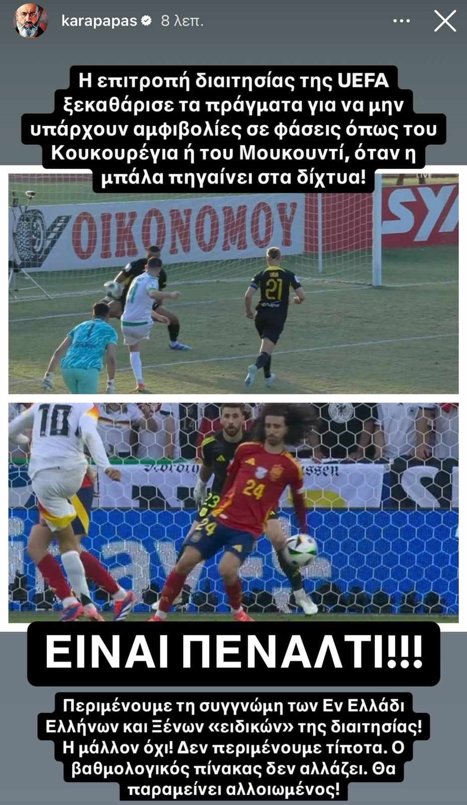 Είναι πέναλτι! Περιμένουμε τη συγγνώμη των ελ Ελλάδι Ελλήνων και ξένων “ειδικών” της διαιτησίας! Ή μάλλον όχι! Δεν περιμένουμε τίποτα. Ο βαθμολογικός πίνακας δεν αλλάζει. Θα παραμείνει αλλοιωμένος», έγραψε στην ανάρτησή του ο Κώστας Καραπαπάς.