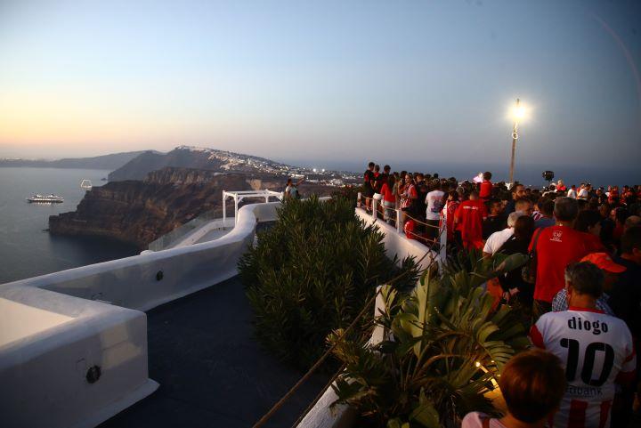 Η Καλντέρα της Σαντορίνης βάφτηκε σε… κόκκινο χρώμα το βράδυ της Τετάρτης (25/9) για τα ευρωπαϊκά τρόπαια του Ολυμπιακού.