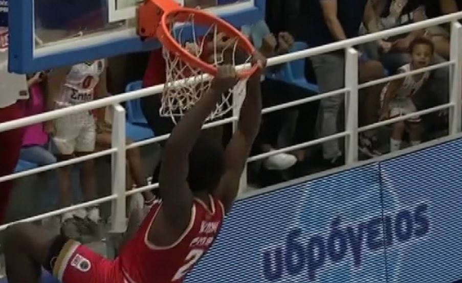 Ο Αμερικανός σέντερ κάρφωσε με όλη του τη δύναμη και… διέλυσε τη στεφάνη με αποτέλεσμα ο τελικός να διακοπεί προσωρινά.