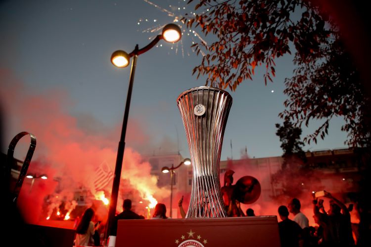 Τα Φάρσαλα ήταν ο νέος σταθμός της περιοδείας του Ολυμπιακού την Τρίτη (1/10) με τον κόσμο της ομάδας να βλέπει από κοντά τα τρόπαια του Conference και του Youth League.