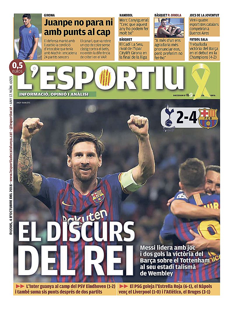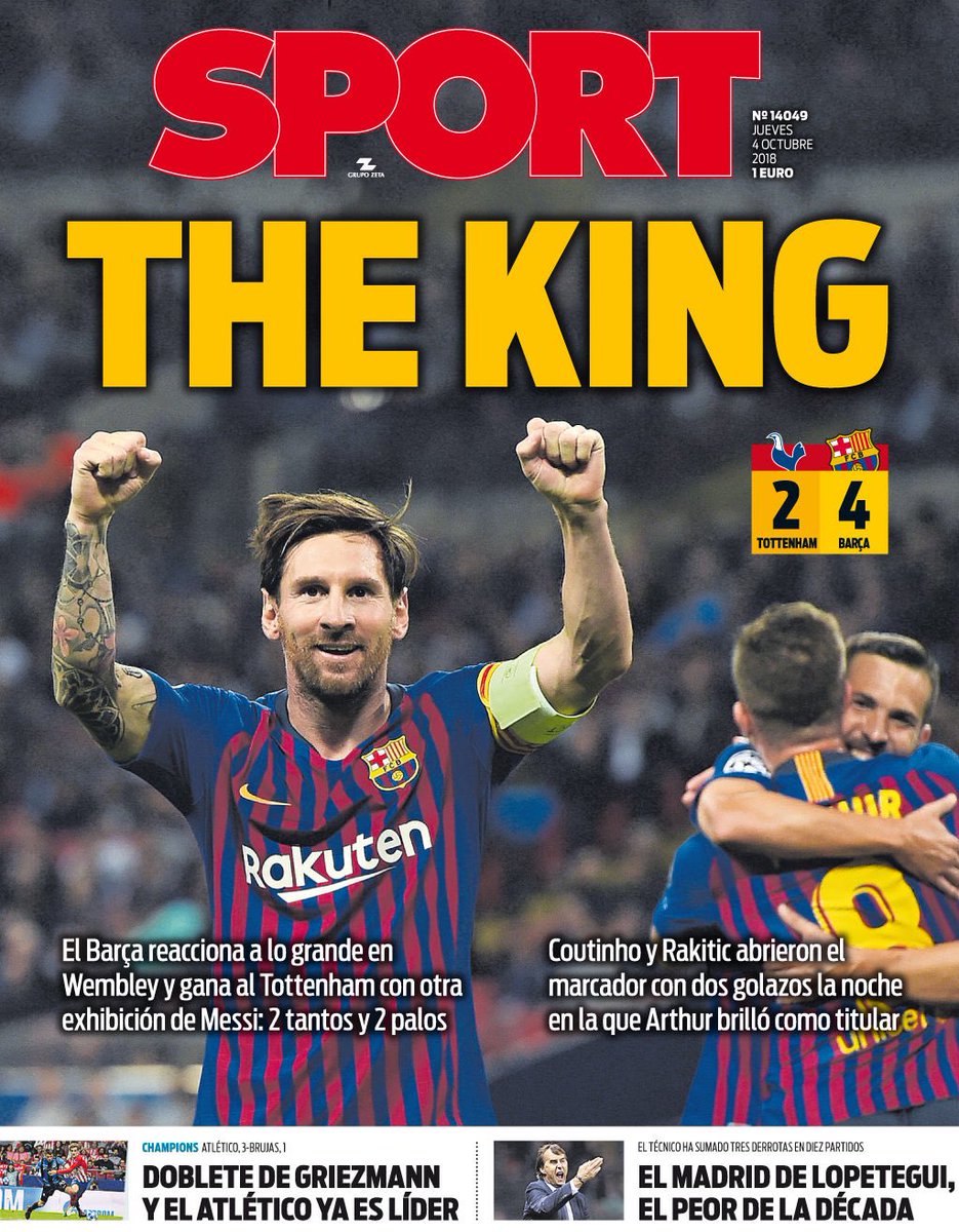 Από την πλευρά της η SPORT χρησιμοποιεί… αγγλικό τίτλο στο πρωτοσέλιδο της: «Ο Βασιλιάς», προσθέτοντας παράλληλα: «Η Μπαρτσελόνα αντιδρά στο έπακρο στο Γουέμπλεϊ και κερδίζει την Τότεναμ με άλλο ένα σεμινάριο του Μέσι: δύο γκολ και δύο δοκάρια»