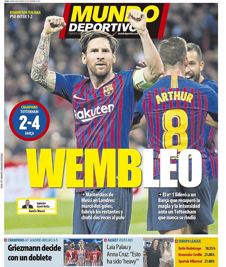 Η MUNDO DEPORTIVO κυκλοφόρησε σήμερα με τίτλο «WEMBLEO» στο πρωτοσέλιδο της, ενώ χαρακτηριστικά αναφέρει: «Επική εμφάνιση του Μέσι στο Λονδίνο: σκόραρε δύο γκολ, δημιούργησε τα υπόλοιπα και σούταρε δύο φορές στο δοκάρι».