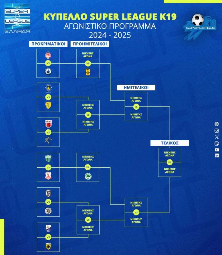 Στο πλαίσιο της διαρκούς αναβάθμισης των διοργανώσεων Υποδομών της Super League, στις οποίες συμμετέχουν τα τμήματα Υποδομής των ομάδων που απαρτίζουν την κορυφαία διασυλλογική κατηγορία ποδοσφαίρου της Ελλάδας, ο θεσμός του Κυπέλλου Super League K19, αποτελεί ένα ακόμα ” σκαλοπάτι” εκπαιδευτικής διαδικασίας, μέσα από ένα πλαίσιο ανταγωνιστικών ποδοσφαιρικών αναμετρήσεων, οι οποίοι, πιθανότατα, κρύβουν και εκπλήξεις, καθώς σύμφωνα με όσα ορίζονται στην «Προκήρυξη Πρωταθλήματος και Κυπέλλου Κ19», το Κύπελλο Κ19 θα διεξαχθεί με τη μορφή μονών αγώνων “knock – out” σε τέσσερις φάσεις.