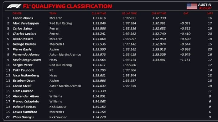 Στην τρίτη σειρά θα βρεθούν οι Όσκαρ Πιάστρι και Τζορτζ Ράσελ της McLaren και της Mercedes αντίστοιχα, την ώρα που ο Λιούις Χάμιλτον ήταν η μεγάλη (αρνητική) έκπληξη αυτών των δοκιμών, καθώς ο επτάκις πρωταθλητής αποκλείστηκε στο Q1, μετά από ένα οδηγικό λάθος στη στροφή 12 και θα εκκινήσει 19ος στο Τέξας.